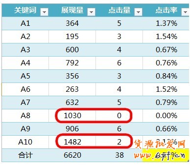 從上圖可以看到,A8和A10無效的展現是非常多的,按照上面的方法,建議把這兩個詞直接刪除,于是點擊率直接從0.57%提升到了0.88%,點擊率提升效果非常明顯,這是提升賬戶整體點擊率的一個方法。這只是一個數字游戲,但是對我們有什么好處呢?或許各位掌柜有聽過這樣的一種說法:賬戶整體的點擊率高,會使得初始得分相對較高,這樣就能在我們推廣初期取得一定優勢。上面介紹的這種方式,只是一個治標不治本的方法,就算初始分高一些,假如不優化,質量分一樣會掉。所以,在進行優化質量得分的過程中,需要一個治本的方法。