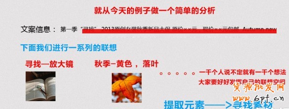 2,在文案信息里面挖掘和海報設計有關的關鍵詞,就此文案來講 “尋找”、“秋季”、“新品”,“大促”都是比較相關的關鍵詞,然后從關鍵詞出發,聯想出一些圖片,設計元素,尋找-放大鏡,秋季-落葉,黃色,等等,大家多多發散思維,說不定能找到更好的設計元素,能提取出更好的設計元素!