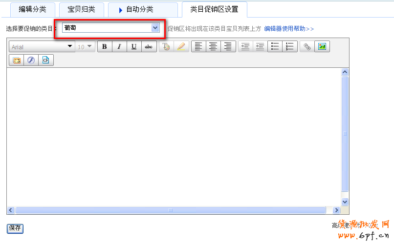 點擊“進入設置”進入類目促銷區設置頁面,進入之后選擇您想設置促銷信息的類目,在自定義內容區編輯你想展示的內容即可,建議高度控制在170px以內,如下圖所示: