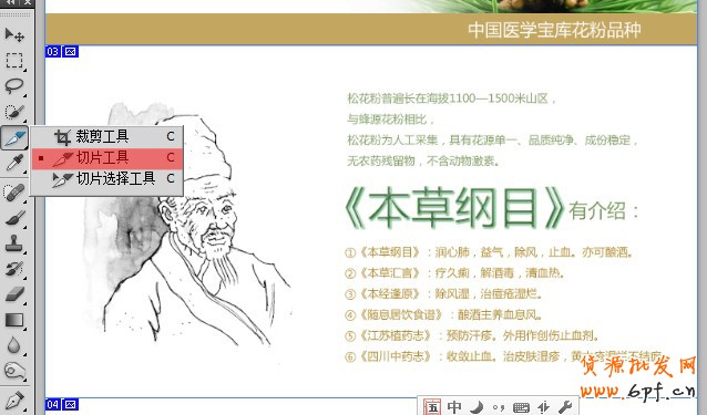 第一步:使用PS的切片工具對需要導出的圖形進行切片。
