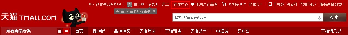 一、使用自己的天貓商家賬號登陸天貓,點擊頁面頭部的“商家中心”。