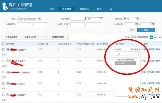 黑名單功能添加在店鋪的ECRM系統中,即賣家中心后臺的會員關系管理中。賣家選擇“客戶管理”,搜索到想加入黑名單的顧客,選擇右側添加標簽中“禁制購買”的選擇,即可將相關顧客加入黑名單。