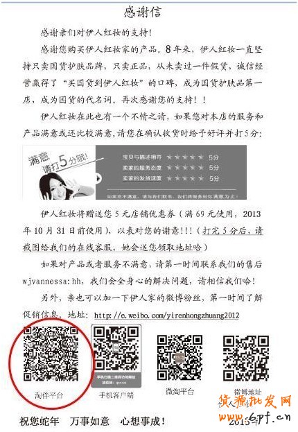 漲粉。為減少客戶因不會操作帶來的麻煩,如何關注淘伴店鋪還做了一個帖子,只要把鏈接、發給客戶就可以讓客戶明白如何操作。(1)在手機助手360助手、應用匯、豌豆莢、安智、木螞蟻等等可以提供下載渠道,搜索關鍵詞:淘伴;(2)掃二維碼,輕松下載。(3)搜索伊人紅妝。為了增強與客戶的交流,伊人紅妝建立了專門的QQ群,在適當的時候提醒客戶掃描店鋪的淘伴二維碼。在店鋪的首頁、寶貝詳情頁面都掛上官方給的淘伴的二維碼,這樣客戶在進入店鋪時也能看到。另外,在每一個發出去的包裹的感謝信頁面上和包裝箱上都放置店鋪淘伴的二維碼,讓客戶能夠方便的關注淘伴。