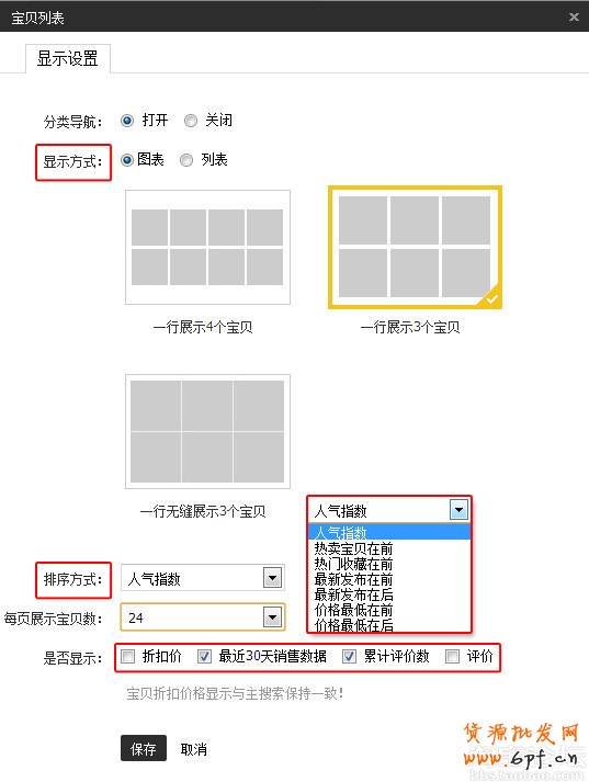 寶貝列表頁是分類的一個引流,引導顧客關注更多產品,雖然這個看似很簡單,里面也是暗藏小技巧的?,F在顯示設置可分為顯示方式:圖表和列表(圖表可一行展示4個寶貝,一行展示3個寶貝,一行無縫展示3個寶貝),除此之外還可選擇排序方式、展示的寶貝數、以及是否顯示折扣價、最近30天銷售數據、累積評價數、評價,這個就需要我們如何根據自身產品情況而展示。此外,左側190px模塊盡量與寶貝右側展示的模塊對齊,這樣會顯得更加整齊美觀。
