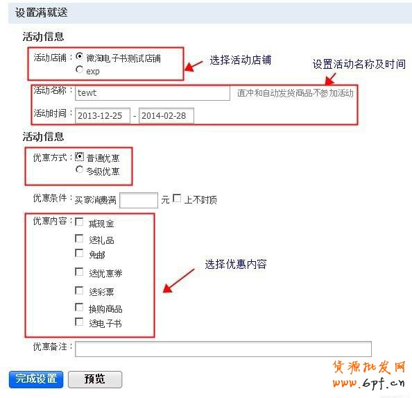 4、根據提示往下設置,可根據需求,設置多階梯促銷活動。多級優惠—最多可同時設置5個不同的主題活動,促銷方式更多樣化?;顒釉O置完成后,點擊預覽、完成設置。