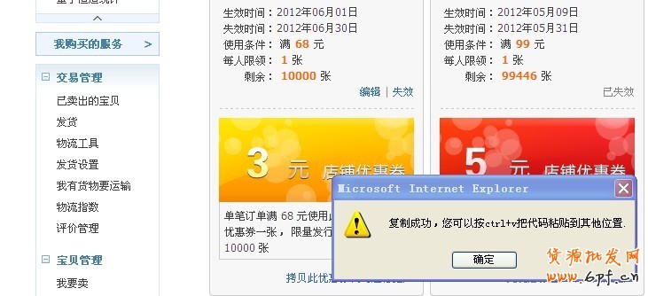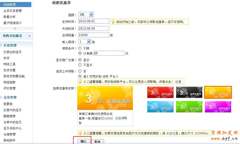 1、進入后臺 ——> 我是賣家 ——>促銷管理——>點擊“店鋪優惠券”——>點擊“創建活動”——>根據店鋪的需要,選填相應的內容 ——>點擊“確認”