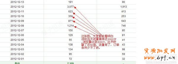 先看流量把,本店平時一天流量有40-50個吧,從12月8日開始流量直線上升,直至12日,單日IP進2000個。