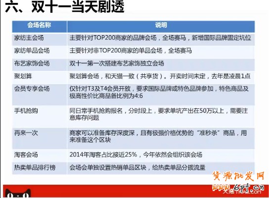 雙11預售占比要達到整個成交的35%。預售分為天貓預售和聚劃算預售兩個部分,聚劃算預售9月24日24點報名正式結束,26日晚上22點截止。所有預售項目的賽馬,是從10月10日正式開始賽馬,10月15日預售的各個會場頁面會正式上線,11月3日聚劃算會場會主推所有聚劃算預售的商品,之前聚劃算所有預售商品是不在主坑體現的。11月10日 23:59:59預售正式結束。11月11日凌晨6點,預售的尾款開始支付。