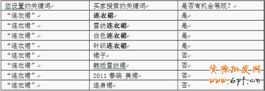 B)若您設置的淘寶直通車關鍵詞是“連衣裙”(中心詞匹配方式)時,當買家搜索連衣裙、雪紡連衣裙、白色連衣裙、針織連衣裙,等時,因為完全包含了您設置的關鍵詞,則有展現的機會。流量較多。