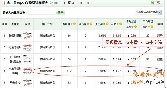 打開推廣效果-直通車基礎數據-寶貝報表-點擊量top50寶貝詳細報表,選出寶貝下面展現量為零的關鍵詞。