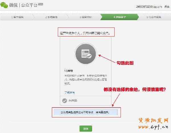 第四步:接下來的這一步就是選擇你的微信公眾賬號類型,運營主體為個人的只能選擇訂閱號類型。什么是訂閱號,就是會被微信放在折疊選項里的公眾賬號啦