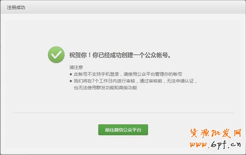 恭喜你!你就已經創建好一個微信的公眾賬號了。不過微信人需要經過審核才算正式開通,微信會在7個工作日內幫你完成審核。也就是說你的微信公眾賬號有可能無法審核通過,所以剛才的填寫公眾賬號信息就需要認真填寫了。