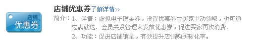 店鋪優惠券:優惠券在現實生活中應用的比較廣泛,很多人的錢包里都會有各大商場抵價券,現金券,優惠卡等等,可見這種方式還是比較受買家所歡迎的,在網上其實也一樣,我們送買家一個優惠券,價格也不低,20元 30元的,如果買家不用的話,他就是感覺浪費了很多東西,在下次購物的時候就一定先到你的店里來看看,所以這是提升買家回頭率非常有效的一個方式。優惠券的主要作用說白了優就是為回頭客下餌,買家在我的店里買了物品我給他一張優惠券,當然在買家下次消費的時候,肯定先來我的店里看看,達成了刺激再來;調動消費沖動、因為抵價券是有時間限制的,例如一買家手里有一張馬上過期的抵價券,他可能就會馬上去買東西,把優惠券用掉,現在在支付寶里做的這個優惠券一般都是30天,過期就作廢了,調動消費沖動.