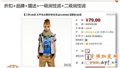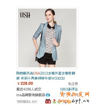 “韓版”風格,這個產品的風格屬性也定下了。“休閑小西裝領短外套”,這組詞匯我之所以放在一起,既可以拆分成“休閑小西裝”“短外套”也可以拆分成“休閑 西裝”“短外套”也就是說,這個短語也覆蓋了很多的搜索信息。最后一組數字“W33030”是這個商品的貨號。其中覆蓋了現在的季節當中以下熱搜詞匯“購物新風尚”“韓版”“女裝”“2013”“西裝”“外套”等等熱搜詞匯。在這里,其實除了熱搜之外,商品的基本屬性表達的也很明確。這是大牌的做法,小賣家可以借鑒,但考慮到小賣家資金實力不夠,所以在設置商品屬性詞時,可以從小處著手,不像他們那么覆蓋廣,力求覆蓋精。