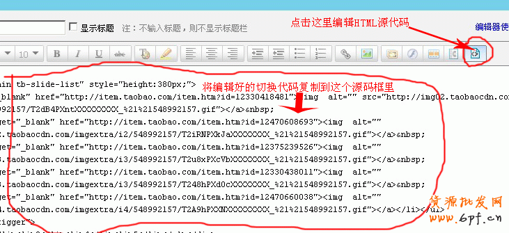 當然先要做好圖片啰!要記住,所要切換的所有圖片大小必須相同,淘寶右邊的這個自定義促銷區寬度為750像素,所以我們的做的切換圖片寬就設成750像素 了,至于高,根據寶貝情況而定,但不要做得太大,以免影響找開速度。做好圖片后上傳到圖片空間,再編輯好切換代碼,至于切換代碼哪里有,在百度搜索一下就 知道了,呵呵。再按以下步驟在自定義促銷區添加代碼: