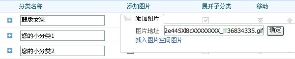 步驟8:將您的大分類改為我們想要的大分類名稱,這里填寫為”韓版女裝“,然后點擊“添加圖片”,粘貼我們剛才復制的圖片地址,點擊“確定”。