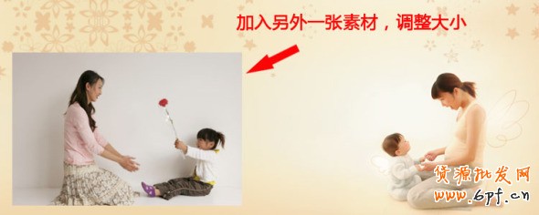 一張海報圖往往有很多其他的元素,比如我設計的這張海報圖主要是推廣媽媽級女士用品的,我希望加入另外一張圖片元素,加入圖片后效果如下,可以看到和背景圖非常不和諧,邊緣生硬