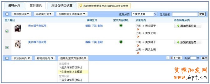 在“寶貝歸類”編輯中,批量選中想要設置同樣寶貝詳情頁模板的寶貝,應用合適的模板,就不需要一個個寶貝重復編輯了。