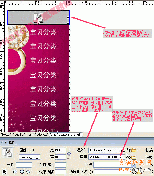 點擊分類名稱的圖片,在源文件處填入對應圖片的網址【圖7】,就是第三步你傳到相、冊后得到的圖片網址【圖6】,必須的哦,否則最后圖片不顯示。然后到你的店鋪得到對應的分類地址(點擊分類名稱,然后復制瀏覽器地址欄里的地址),在下面鏈接處黏貼網址【圖7】,依次為全部圖片添加上對應的圖片地址以及分類鏈接。這步很關鍵,圖片必須對應,分類網址也必須對應,建議一個圖片接一個圖片的來。頂部以及底部有裝飾類的圖片的話,就只給換上圖片網址就行,無需加鏈接了。