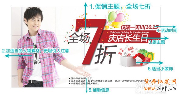 上面這張淘寶促銷海報已經把所有用到的元素標識出來了,大家一看一目了然,主次之分很明顯。我詳細講解一下這6點,大家了解了這6點后,自己多做圖后就駕輕就熟做其他淘寶促銷海報了。