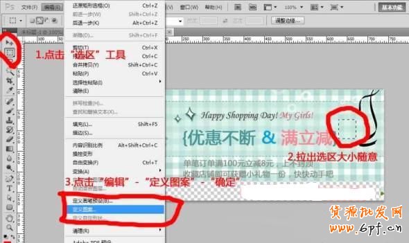 13.先打開之前已經制作好的模板,使用“選區”工具拉出一個需要的選區,然后點擊“編輯”-“定義圖案”-“確定”。