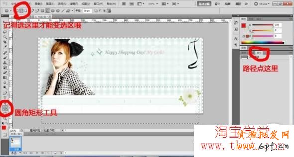7.從這里開始我們需要一個軟件,就是著名的PHTOTSHOP,沒有的掌柜就快去下載吧??!不會用就不能算是合格的掌柜哦!它是使我們店鋪和寶貝變漂亮吸引人的重要工具哦!在打開PHTOTSHOP之后,首先新建一個圖層,寬度為740270,這個可以根據模板的不同是可以改變的。然后把我們剛剛下載的模板圖片復制進入,如果圖片大了就按CTRL+T來調整大小。之后因為模板有些多余的部分,那么我們可以使用“圓角矩形工具”來拉出不需要的部分,再點擊右邊的“路徑”把路徑變成選取,在按DEL就可以刪除不要的部分了。