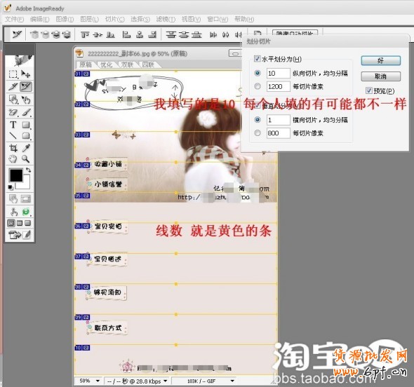 為了打開網頁時加快模版顯示出來的速度,我們需要把模版切成一片片,分別上傳到相冊上,這樣打開網頁,每個模版切片同時顯示,大大減少了頁面打開的時間,買家也不會等到不耐煩了,下面是把模版切片操作: