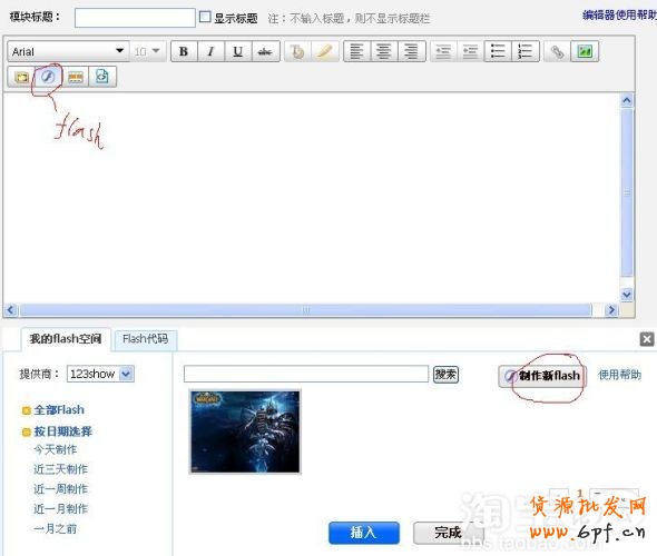 123Show寶貝動態展示服務,首先點擊編輯,進入后點擊插入Flash按鈕,下圖