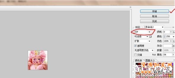 然后選擇存儲為網頁和設備所用格式,并在跳出的對話框中選擇gif格式,單擊確定
