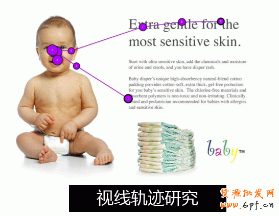 這是一張嬰兒紙尿褲的平面廣告初稿,并不是很有創意,因為它產品的賣點是用文字說明的(大標題)。初稿完成后老外們找了很多的人來看,記錄下他們瀏覽不同位置的先后順序和重點查看的位置,來進行視線軌跡研究,發現人們往往把他們的賣點(大標題)放在最后瀏覽。那么這些人是否對大標題產生深刻的印象了呢?于是他們又做了另外一個實驗: