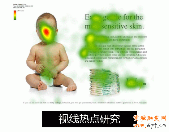 通過記錄統計發現,很遺憾,人們的目光都聚焦在了嬰兒的臉上(紅色位置為重點瀏覽位置)!對他們的產品賣點的關注可以忽略不計!可以說是個失敗的廣告。那么我的問題來了!如果讓你做一個簡單的修改,讓人們的目光轉移到文字標題上,你會怎么做?(思考時間,先別看答案哦!)
