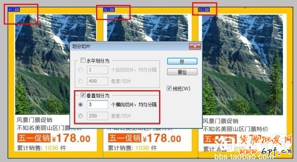 因為我做的是三欄效果的,所以我們可以用“切片選取工具”,把鼠標放到選區內,鼠標右鍵,點擊“劃分切片”,在彈出的選框中選擇“垂直劃分為”填寫3,可以明顯的看到我們的選區分為了無限接近相同大小的三個區域。如圖: