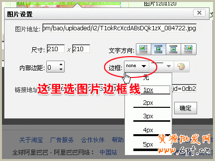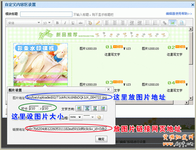 5、回到店鋪裝修中,把光標在圖片設置中的“圖片地址”處的框中點下,使用組合鍵Ctrl V粘貼貼入圖片地址,“尺寸大小”處輸入你需要的大小,(如圖片為寬210、高210,如下圖就輸入210210就可以),“鏈接地址”處貼入你的產品網頁地址。http://www.tbxt.com