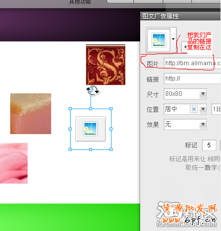 那我們現在就可以把這些之前放在淘寶空間相冊的圖片的鏈接復制在上圖的圖文廣告里面,然后自行調整圖片的大小。