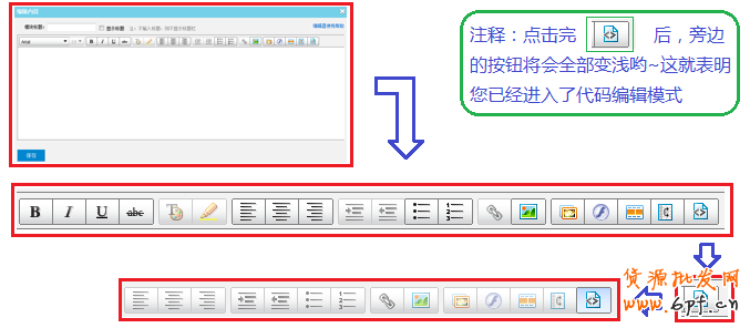 第二步:模塊已經添加了,現在我們雙擊剛剛添加的自定義內容區,就會彈出編輯界面,我們可以看到上面有一排按鈕,這時我們點擊最右邊的那一個按鈕,我們就進入了代碼編輯模式了,來看看步驟圖: