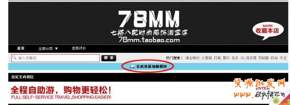 之后找好我們要在這個模板放在店鋪的頁頭還是頁中頁尾,定好之后點擊在此處添加新模塊,