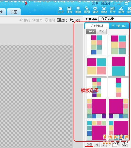 接下來顯示剛才設置好的背景圖,鼠標點擊上面拼圖,彈出讓我們選擇樣式,點擊第3個模板拼圖(模板拼圖里面有很多軟件自帶做好的模板,很漂亮,多種選擇,非常適合新手)