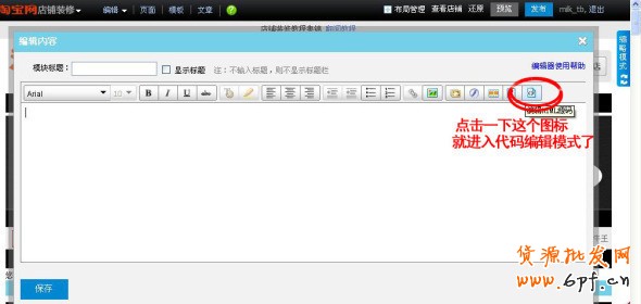 添加之后頁面會出現一個自定義區內容的裝修模板,我們點擊編輯進入,一片空白,就是要這個效果,大家有過自行裝修店鋪的都應該來過這個頁面。這時候我們鼠標移動到右邊上角的最后一個圖標,就是編輯HTML源碼,點擊一下該按鈕,