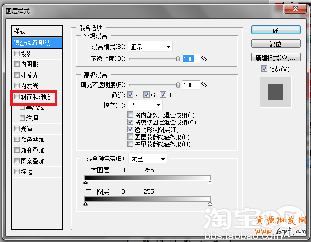 單擊“混合選項”菜單項,在彈出的圖層樣式中選擇“斜面和浮雕”