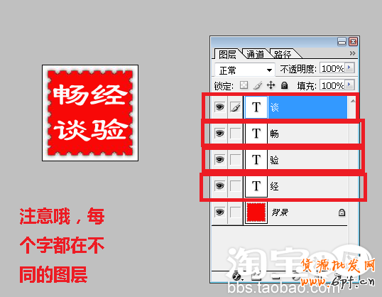依次輸入自己想要輸入的文字,比如“經驗暢談”,為了排列的方便,最好每個字單獨處于一個圖層。