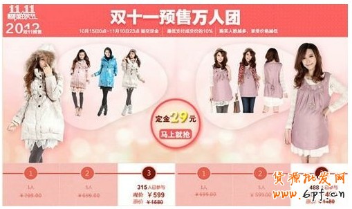 具體玩法:商家規定從10月15日0點開始至11月10日23點之間可以為A款商品預付定金29元。當有1人下單預購時,A的價格為799元;當有 2~5人購買此款商品時,A的價格則調整為699元;當購買人數超過5人購買此款商品時,此款的商品價格則調整至商家設定的最低價格599元,并且不管購買人數增加與否,商品的價格都不再調整。