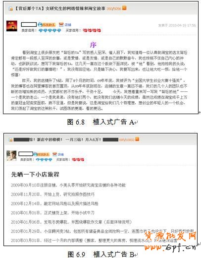 比如有一個帖子是叫做“女研究生的網絡情緣和淘寶故事”,里面在一開始就為自己的店鋪做了廣告,比如“昨天,我的店鋪升了5鉆,用了8個月的時間,2009年年底,我被評為‘全國大學生創業大賽十強獎’,我的博客也在阿里博客的首頁置頂,從2009年年底到現在,店鋪的生意一直還不錯,我們的幾個人的團隊也不斷地在增加新的成員,大家都忙得不亦樂乎,干勁十足。”如圖6.8所示。