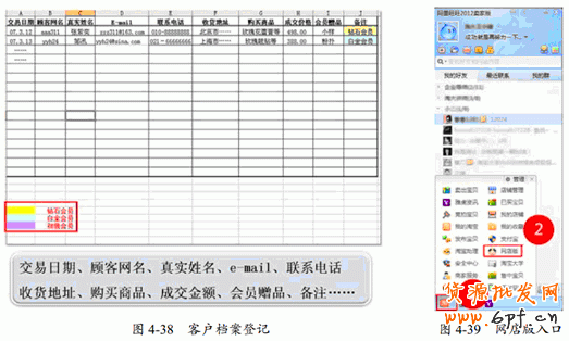 建立客戶檔案,將來可以隨時查詢顧客的消費記錄和會員折扣,可以從他們的購物清單和購物頻率上分析顧客的消費習慣以及消費心理,以便及時跟進各種促銷宣傳,或者是推出顧客感興趣的優惠活動??梢允褂靡恍┤?ldquo;網店管家”一類的網店管理軟件來建立客戶檔案,也可以自行設計一個如圖4-38所示的Excel表格來錄入客戶資料,需要列明的項目主要有交易日期、顧客ID、真實姓名、電子郵箱、聯系電話、收貨地址、購買商品、成交金額、購物贈品、會員級別等。