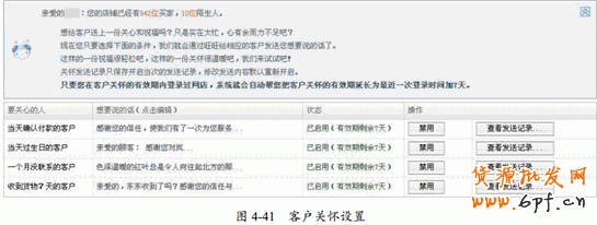 客戶關懷。淘寶網的網店版軟件還提供了客戶關懷功能,如圖4-41所示。只要選擇好要關心的客戶類型,如當天確認付款的客戶、當天過生日的顧客、一個月沒有聯系的顧客和收到商品7天還沒確認收貨的客戶,設置好要對他們說的話,在預定時間就會通過阿里旺旺給相應的客戶發送信息。