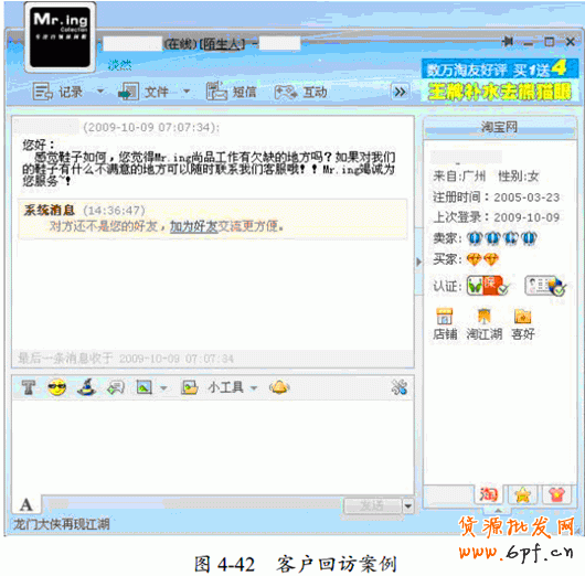 新品通知。在交易圓滿完成以后的回訪里,詢問客戶是否介意收到店鋪的新品通知和促銷信息,如果客戶的反應是積極的,那么就可以將此客戶加入愿意接受促銷信息的淘友分組,在有新品上架或者店鋪推出促銷活動時,就及時用阿里旺旺通知他們。但是新品通知和促銷活動要設計巧妙,一切要從客戶角度來考慮,抓住他們的心就等于抓住了人氣,才能創造出良好的銷售業績。