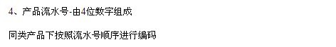 4:產品流水號:由4位數字組成,也可以是3位等等。(由0001---9999來編寫絕對夠用,不會有重復編碼)