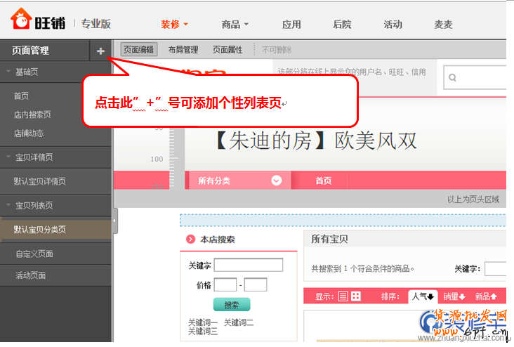 保存完成之后就可以對新建的寶貝列表頁進行裝修了,具體裝修操作和店鋪首頁相同