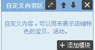 1:打開店鋪裝修頁面,加入我們要將店鋪收藏圖片放在首頁的左側欄。我們先登錄店鋪裝修頁面:我是賣家--店鋪管理--店鋪裝修,將鼠標隨便移動到左側欄的任意模塊,點擊模塊右下角出現的【+添加模塊】,如圖:
