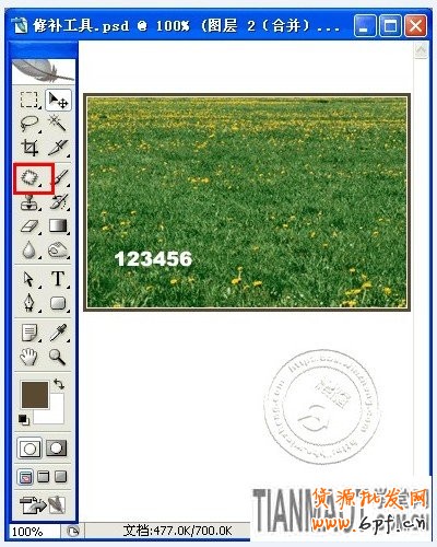 如果圖片的背景色彩或圖案比較一致,使用修補工具就方便很多了。具體操作步驟是:選取修補工具,在公共欄中選擇修補項為“源”,關閉“透明”選項。然后用修補工具框選文字,拖動到無文字區域中色彩或圖案相似的位置,松開鼠標就完成復制。修補工具有自動匹配顏色的功能,復制的效果與周圍的色彩較為融合,這是修補工具的優點所在。如下圖: