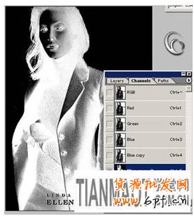 把圖導入ps,轉入通道, 然后選擇BLUE通道來進行操作,如下圖: